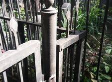 Это старая и мощная ограда. По словам клиентов ей более 60 лет. Достаточно длительный срок нижняя часть ограды находилась в земле, это ускорило коррозию металла, некоторые прутья разболтались, и задняя часть ограды провисла. Необходимо было отремонтировать ограду и покрасить ее.